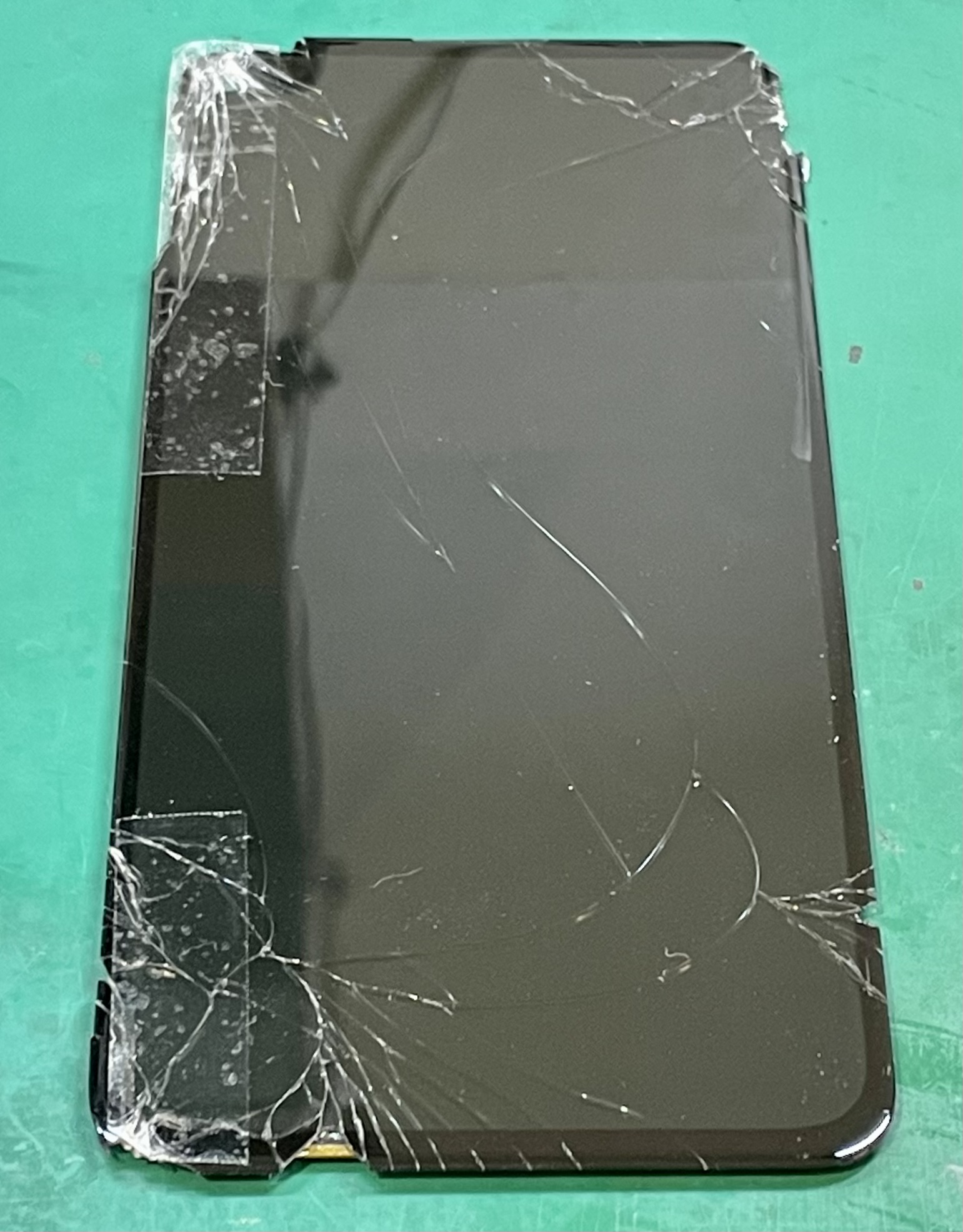 フレームに残ったガラスの破片や粘着を除去して、新しい画面(フロントパネル)の動作確認です。