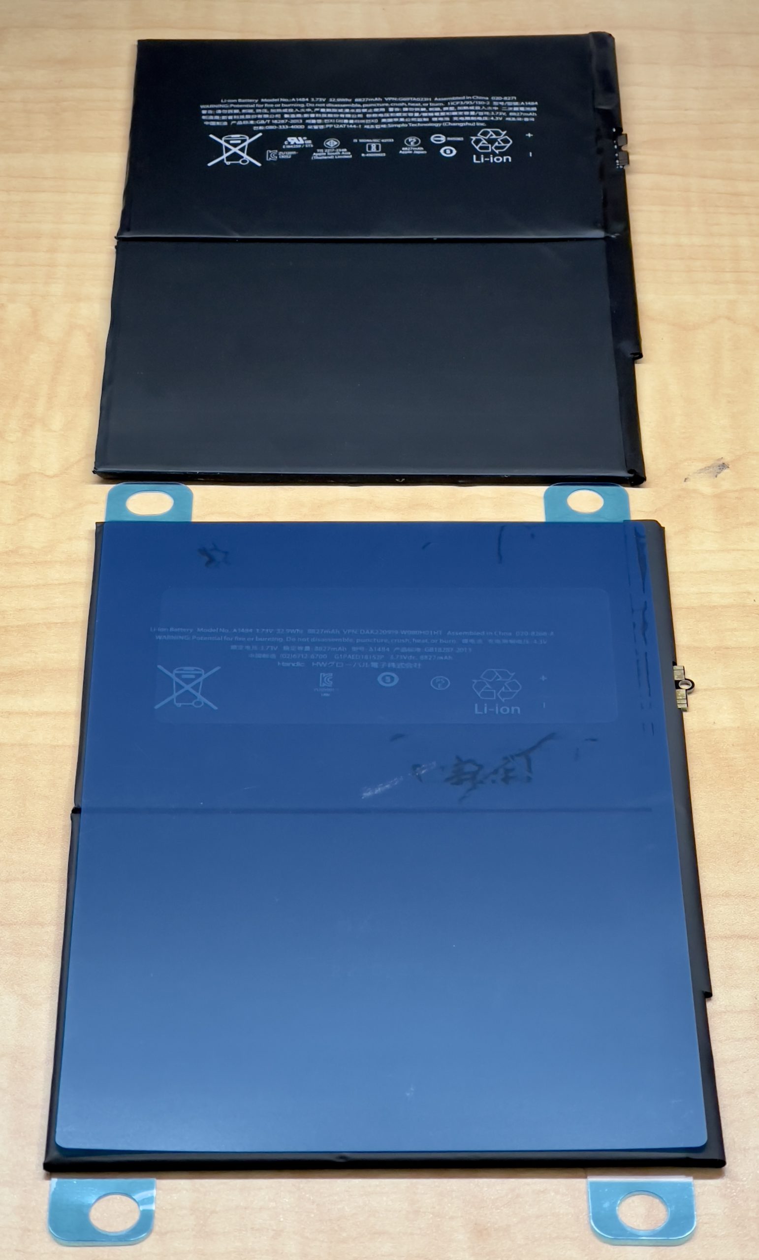 上が劣化したバッテリーで、下が交換予定の新品バッテリーです。