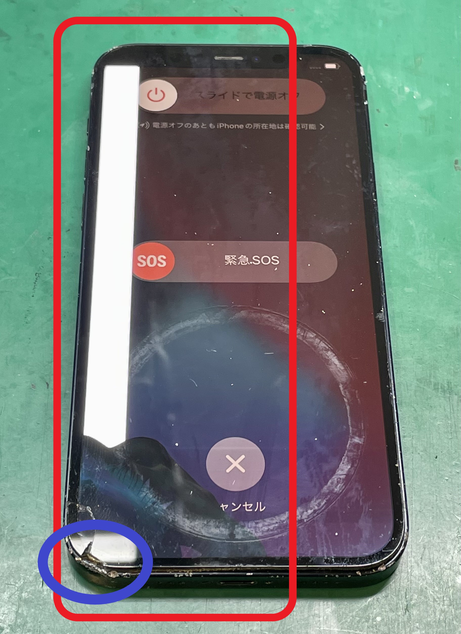 ガラス割れは大したことが無かったですが、赤枠内の通り見事に有機ELディスプレイが故障。