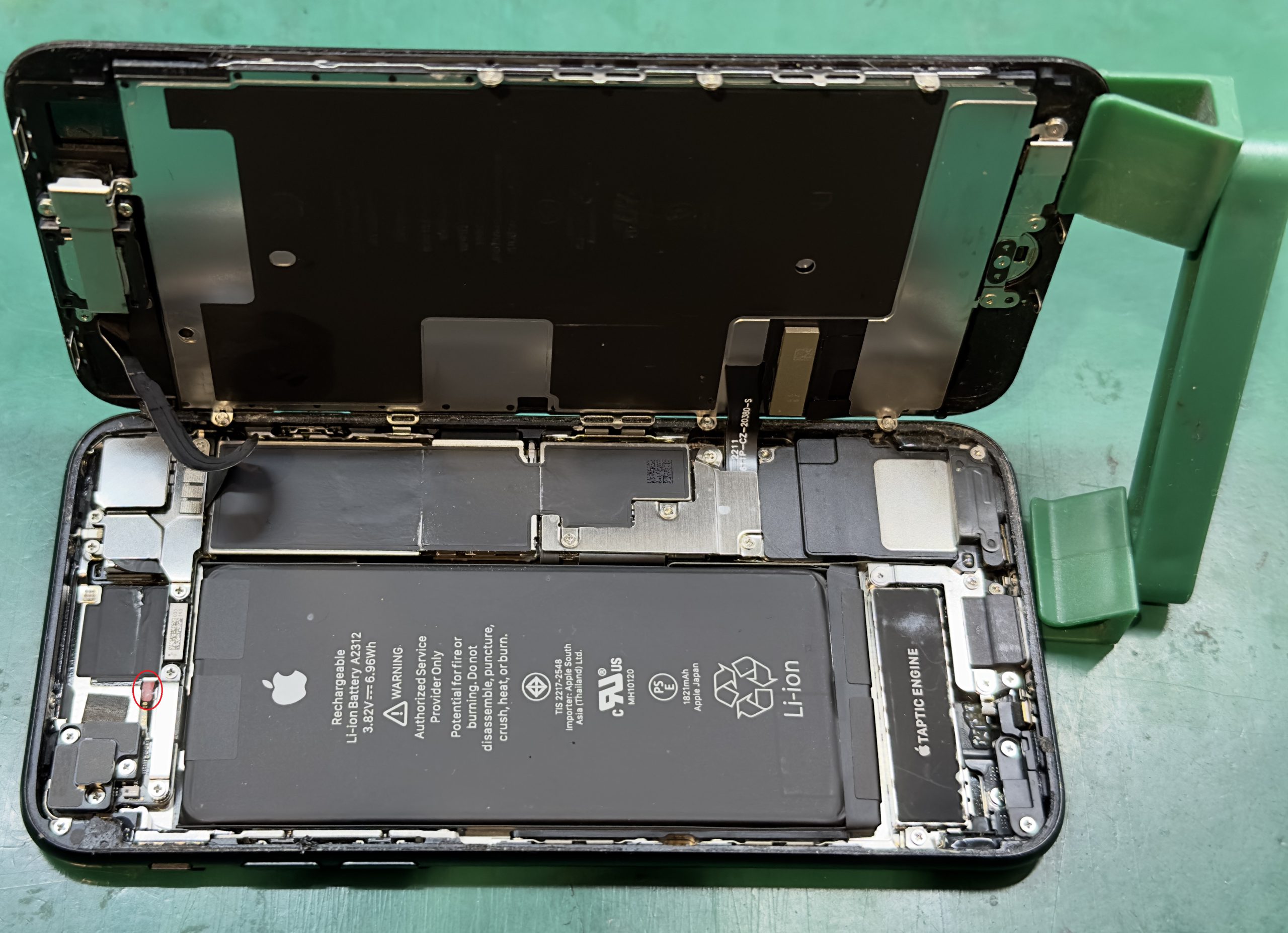 但し、赤い丸印内を確認すると判りますが、水没判定シールが陽性(赤(陰性の場合は白))反応を示しております。
